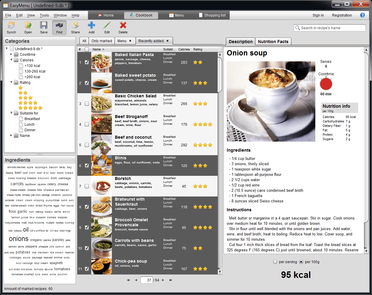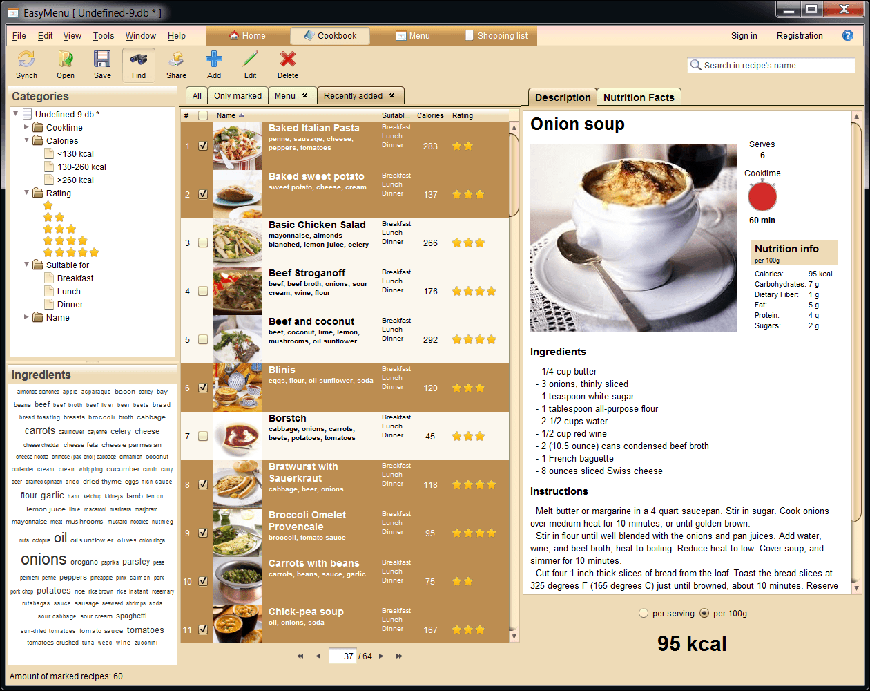 In the middle panel there are the recipes. All recipes in your cookbook are shown here and are automatically marked when the application starts for the first time. Clicking on checkbox of the recipe unmarks it, and clicking on checkbox again marks it. The recipes can be sorted according to the properties such as cooktime etc, or alphabetically.