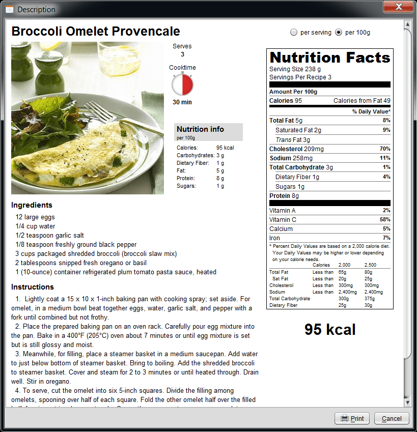 The right panel shows the detailed description of the recipe selected in the middle panel. It contains the picture, list of ingredients, cooking method and cooking time. "Nutrition Facts" tab shows Nutrition Facts label for selected recipe.