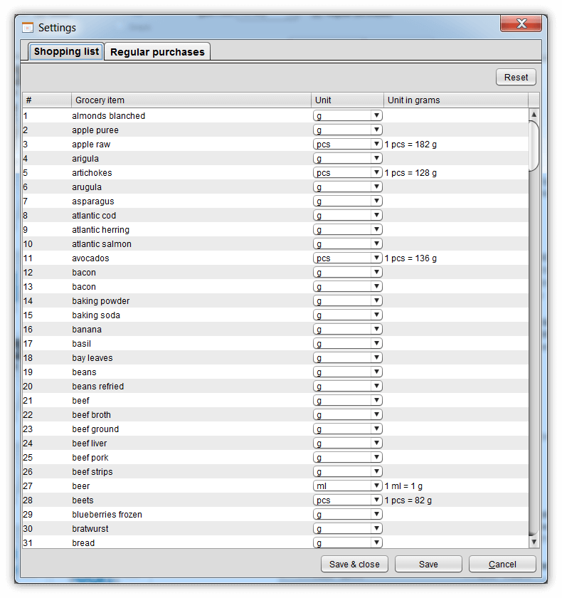 - You can set the desired units of measurements for groceries - grams, oz or pieces for some groceries