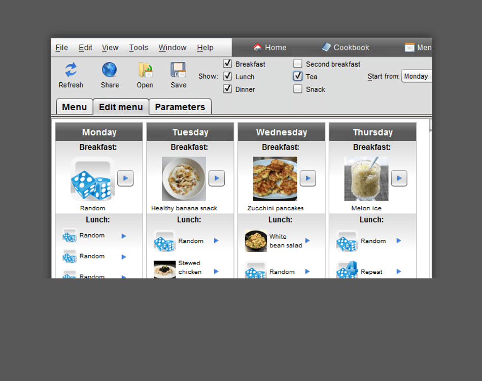 - Menu can be generated for Breakfast, Second Breakfast, Lunch, Tea, Dinner and Snack